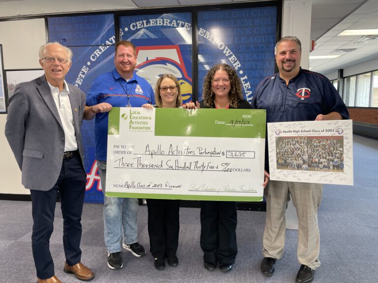 The District 742 Local Education & Activities Foundation announces that the Apollo Class of 2003 raised $3,635 for the Apollo High School Student Activities Program at their recent 20th class reunion. The funds will be kept in the LEAF activities participation fund and used as needed to support Apollo activities by paying for physicals, transportation, or purchasing needed equipment so that current Apollo students can participate.